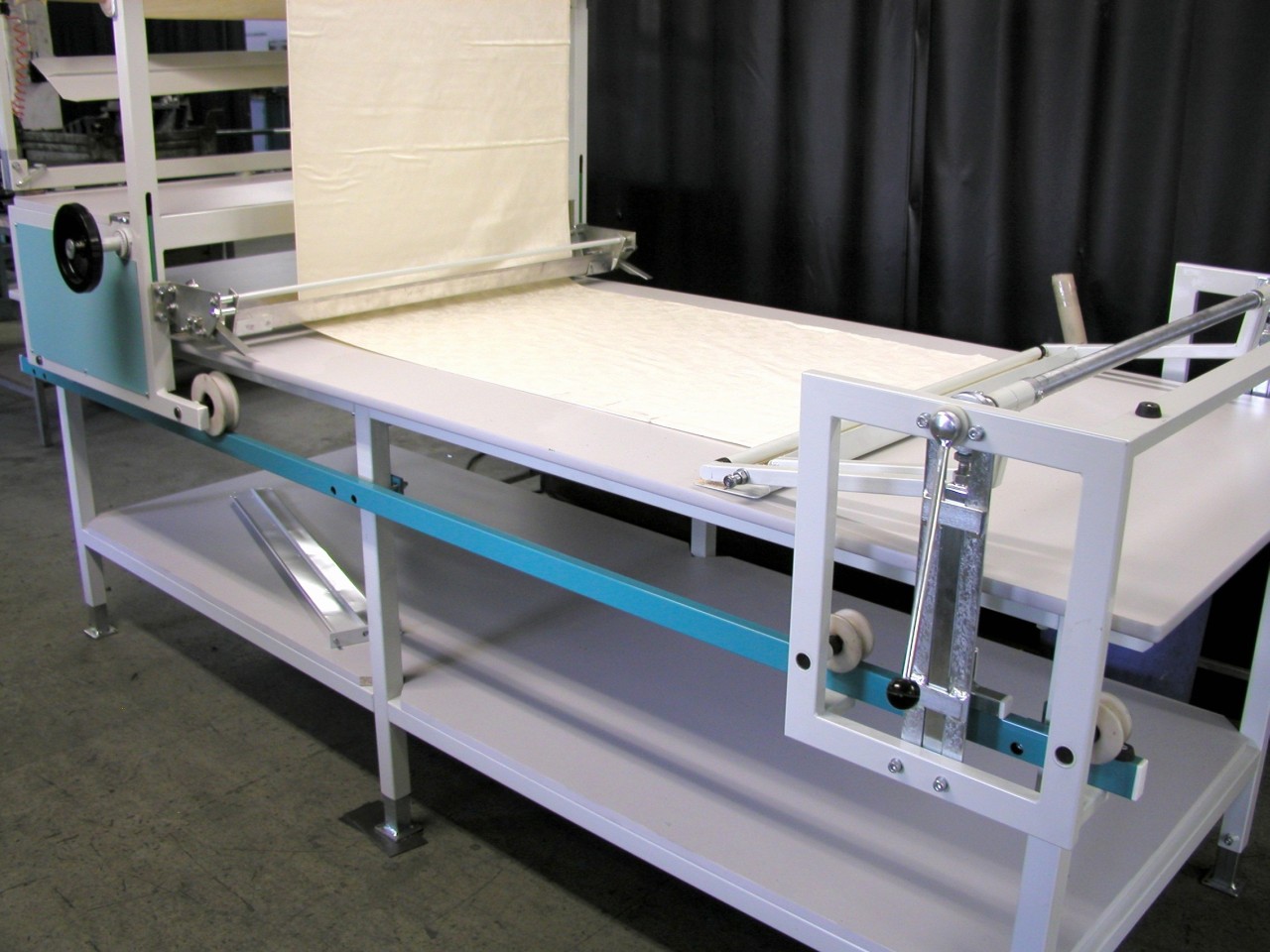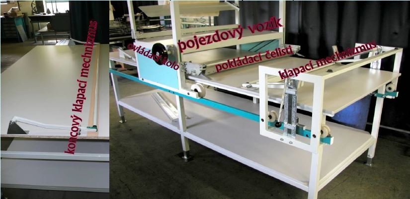 Po nastavení potřebné délky polohy, přejíždíme vozíkem mezi krajními polohy. Pokládací vozík sám zachycuje látku v krajních polohách.
