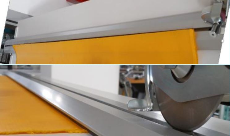 Přítlačná lišta-po odřezání látky zůstává odřezaný díl na přítlačné liště a po jejím nadzvednutí propadne odřezaný díl pod přítlačnou lištu, která jej stlačí a zabrání tím jeho samovolnému pohybu po pracovní desce (používá se pro stohování)