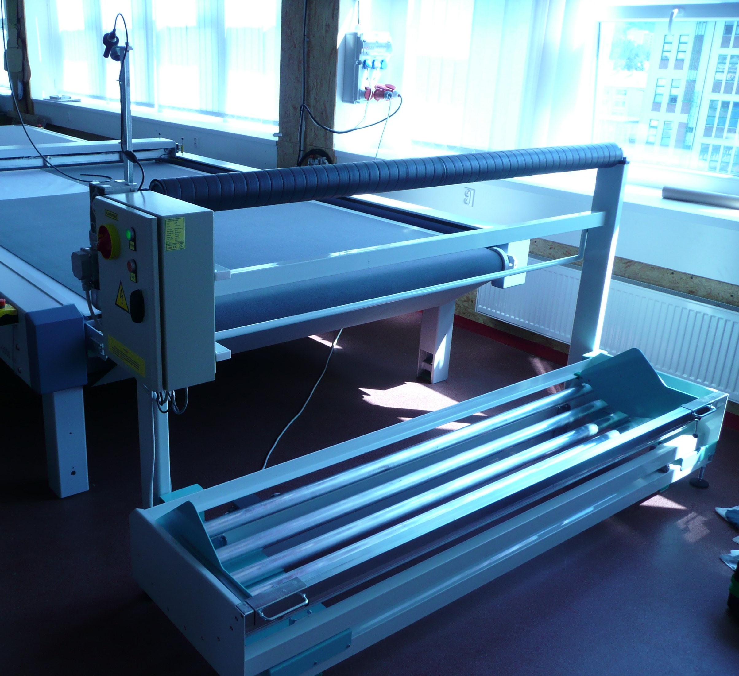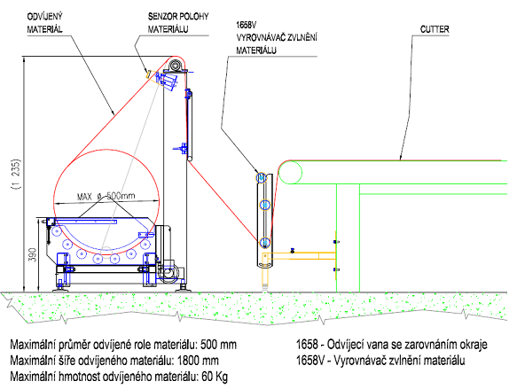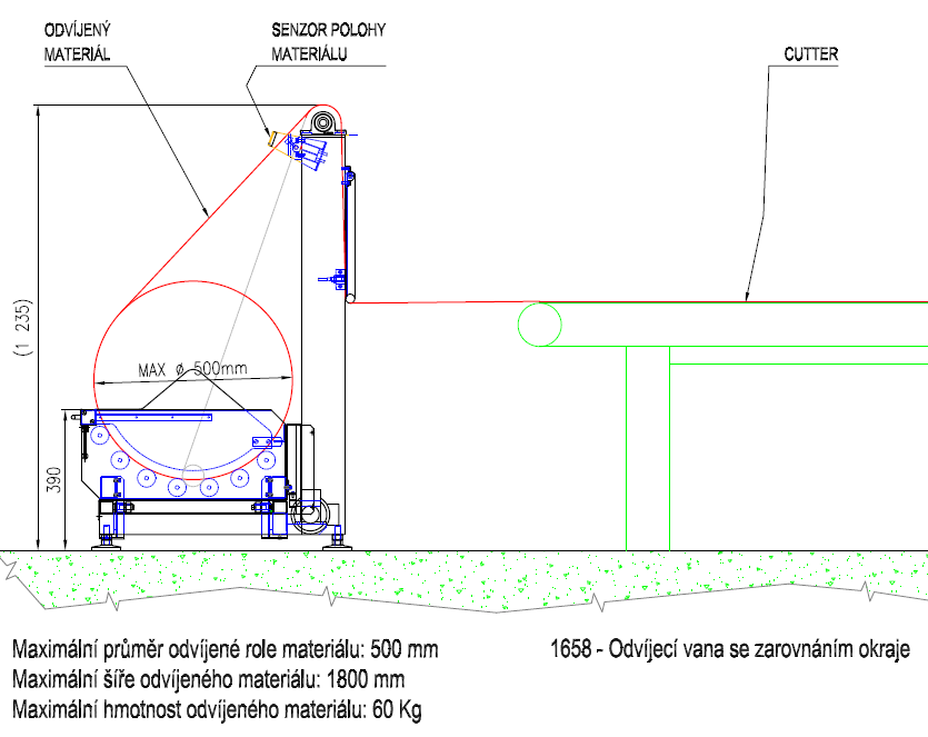 Zařízení slouží pro pomocné odvíjení materiálu s zarovnáváním okrajů